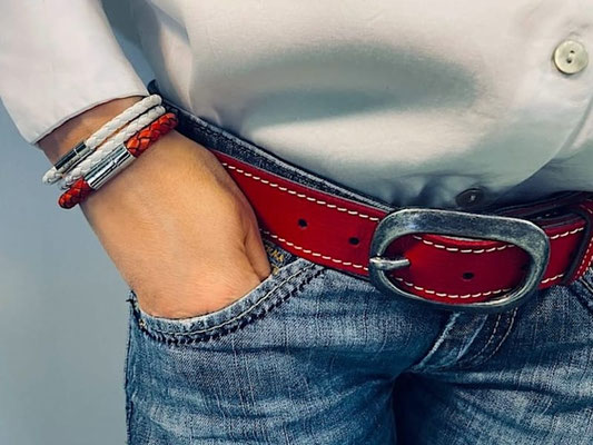 Handgefertigte Damen Lederarmbänder im Design wie aus einem Guss: Das einfach gewickelte Vintage schimmernde und warme 6mm Antique Red und das 4mm doppelte gewickelte kühler wirkende Ionian White. Neben den Farben spielen wir hier auch mit den Kontrasten von warm und kalt. Wer Kontraste mag, die in der Summe eine wunderbar organische Symbiose bilden, entscheidet sich für diese Farbkombination. Beide Bänder sind die idealen Begleiter in sommerlichen Tagen und passen perfekt zu Naturstoffen wie Leinen und Baumwolle. Mit feinem Edelstahl Verschluss und drei Jahren Garantie.