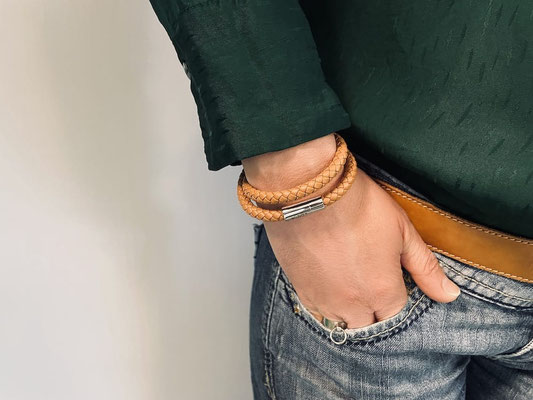 Lässt sich gut mit allen möglichen Farben kombinieren. Obwohl das Armband etwas stärker und doppelt gewickelt ist, wirkt es auch an meinen schmalen Armen unaufdringlich.