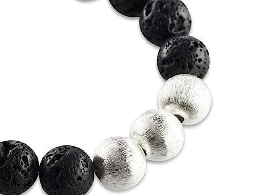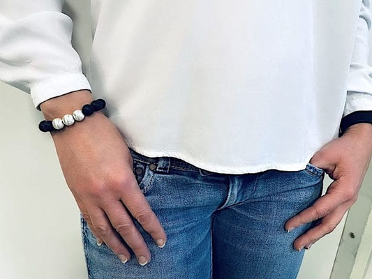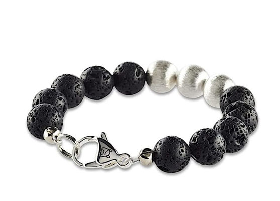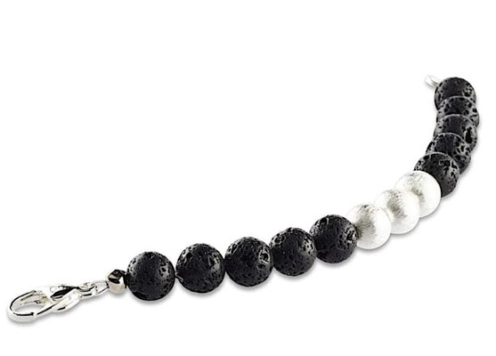 Schwarze vulkanische Perlen bilden den feinen Rahmen für die mit 925 Silber überzogenen fein geschliffenen 3 Perlen in diesem handgefertigten Damen Armband. Jede Perle in diesem Damen Armband ist einzigartig ausgebildet und kommt nur einmal auf dieser Welt vor. Der formschöne Karabiner ist ebenfalls mit 925 Silber platiniert und rundet das edle Erscheinungsbild ab. Die schwarzen Lavaperlen in 10mm Durchmesser stammen aus indonesischen Vulkanen und sind naturbelassen. Mit diesem Armband trägt die Frau von heute Millionen Jahre altes Gestein an ihrem Handgelenk.