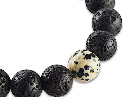 In diesem handgefertigten Damen Perlenarmband ist ein mexikanischer Dalmatiner das Highlight in Verbindung mit den schwarzen Lavaperlen aus Indonesien. In dem gefleckten Dalmatiner Jaspis spiegelt sich die schwarze natürliche Färbung der Lavalperlen aus erstarrter Magma wider. Weil jede Lavaperle einzigartig ist und auch jeder Dalmatiner Jaspis eine individuelle Maserung zeigt, ist jedes 10mm Damen Perlenarmband ein Unikat. Mit dem Karabiner aus nichtsrostendem Edelstahl lässt sich das Armband leicht verschließen. Mit Liebe handgefertigt in unserer deutschen Manufaktur.