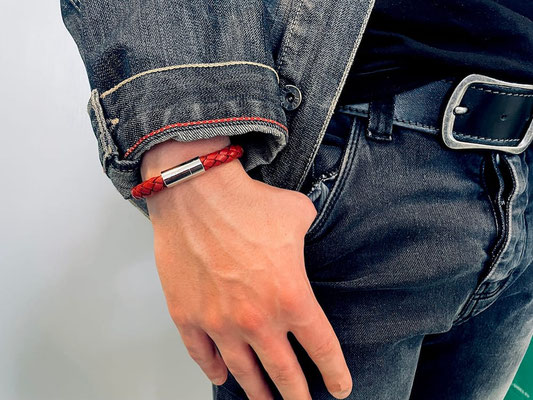 Das stylische handgefertigte Crazy Frog Lederarmband für Herren im dominanten Monza Red. Für Männer, die noch Männer sind. Dieses Armband lässt sich auch sehr schön mit einem schwarzen Armband aus unserer Kollektion kombinieren. Das Rot ist jedoch kein schreiendes und aufdringliches Feuerwehrrot. Sondern die weiche rote Farbe übt sich in einer gewissen Zurückhaltung und wirkt mit dem schönen Edelstahlverschluss inkl. Logo sehr hochwertig. Wie alle unsere Lederarmbänder wird auch dieses Modell in unserer Manufaktur in Deutschland hergestellt.
