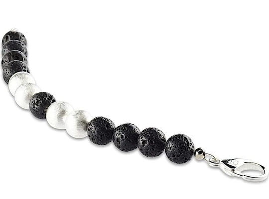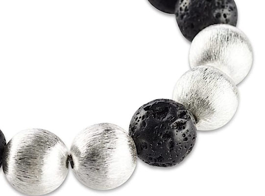 Schwarze Lavaperlen bilden hier den exklusiven Rahmen für die mit 925 Silber überzogenen fein geschliffenen 4 Perlen. Jede Perle in diesem handgefertigten Herren Armband ist einzigartig und bildet ein absolutes Unikat. Der Karabiner ist ebenfalls mit 925 Silber platiniert und rundet das edle Erscheinungsbild ab. Die schwarzen Lavaperlen stammen von indonesischen Vulkanen und sind naturbelassen. Mit diesem Perlenarmband tragen Sie Millionen- und vielleicht sogar Milliarden Jahre altes Gestein an Ihrem Handgelenk.
